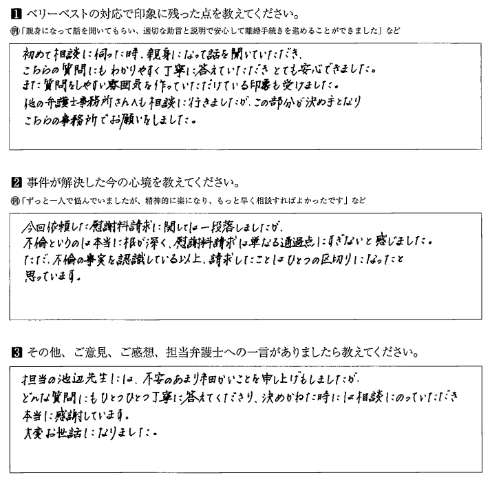 今回依頼した慰謝料請求に関しては一段落しましたが、不倫というのは本当に根が深く、慰謝料請求は単なる通過点にすぎないと感じました。